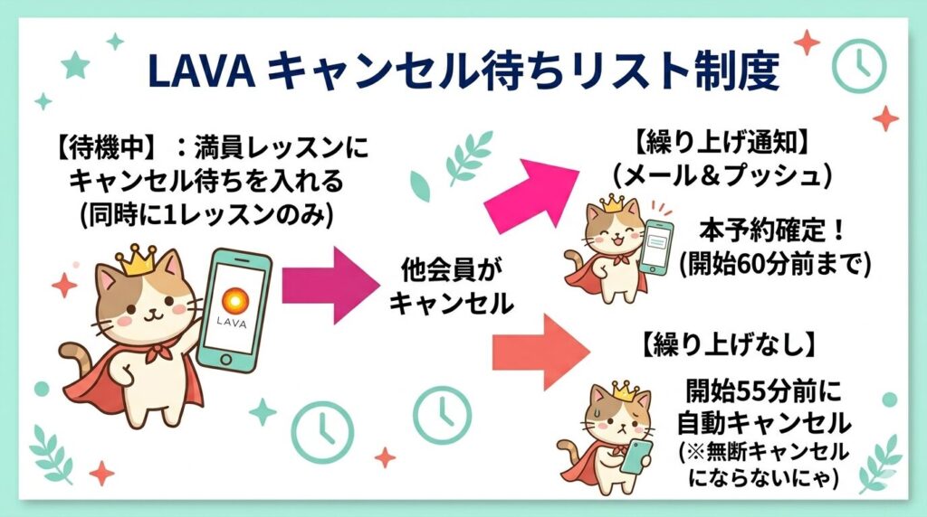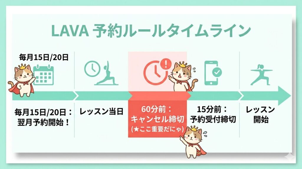 LAVAでは無断キャンセル(60分前を過ぎたキャンセル)が続くと、予約機能が制限される場合があります。